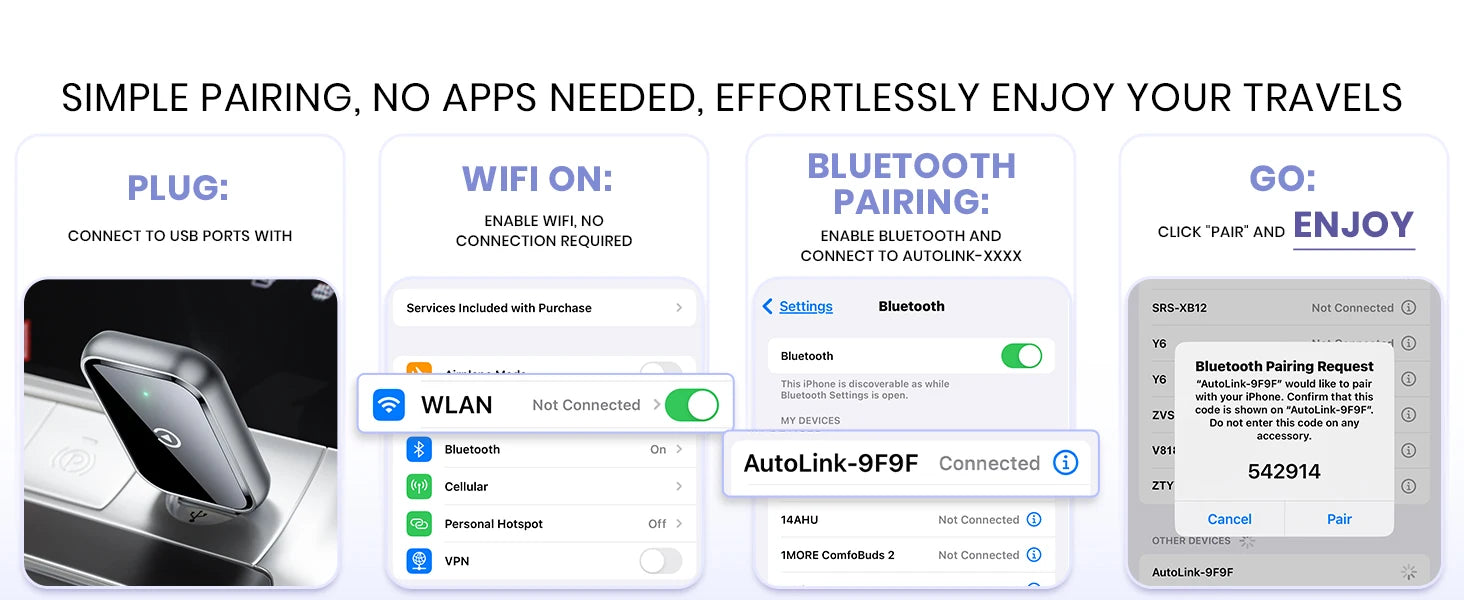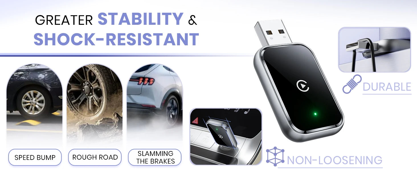 2、【Stable Connection Advantage】: Our no-cable design eliminates the common issues of cable breakage from bending and disconnection from adapter movement on bumpy roads, a common issue with other adapters. Plug and play with auto-activation of Car Play wireless connection each time you start your car, even if the adapter is in your pocket. Say goodbye to frequent cable plugging, phone damage, and forgetting your phone in the car. Experience the convenience and reliability of our superior.